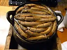 Dojo nabe (Japanese: 泥鰌鍋 or ドジョウ鍋; dojō nabe) is a Japanese nabemono dish.[1] To prepare the dish, pond loaches are cooked in a hot pot. The freshwater fishes are either killed ahead of cooking or are first soaked in cold sake and then cooked alive.