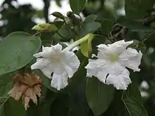 The tree attains a height of 16 m. Leaves are pinnate compound 10 cm long on a 5 cm long stalk. Flowering occurs in April–June. Flowers are trumpet-shaped and white. The fruit capsule is up to 30 cm long.[2]