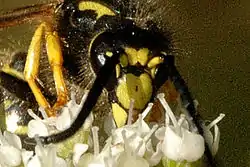 Tree wasps carry out worker policing and have a haplodiploid sex-determination system; this results in a high level of relatedness within the colony.[5][6] The workers will take over all of the foraging from the queen once the first workers reach adulthood. Worker wasps typically forage for other insects, the nectar of plants, and wood to digest for nest construction.[4][7] The tree wasp is sometimes a victim of the nest parasite Dolichovespula omissa, who lays their eggs in the nest of D. sylvestris, as well as individual parasites including roundworms.[8][9]