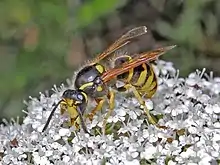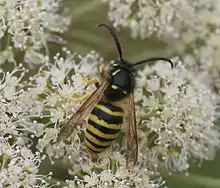 The tree wasp (Dolichovespula sylvestris) is a species of eusocial wasp in the family Vespidae, found in the temperate regions of Eurasia, particularly in western Europe. Despite being called the tree wasp, it builds both aerial and underground paper nests, and can be found in rural and urban habitats.[2] D. sylvestris is a medium-sized wasp that has yellow and black stripes and a black dot in the center of its clypeus.[3] It is most common to see this wasp between May and September during its 3.5 month colony cycle.[4]