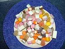 Dolly mixture is a British confection, consisting of a variety of multi-coloured fondant shapes, such as cubes and cylinders with subtle flavourings, and sugar-coated jellies.[1]