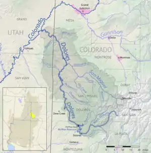 The Dolores River is a tributary of the Colorado River, approximately 241 miles (388 km) long,[2] in the U.S. states of Colorado and Utah. The river drains a rugged and arid region of the Colorado Plateau west of the San Juan Mountains. Its name derives from the Spanish El Rio de Nuestra Señora de Dolores, River of Our Lady of Sorrows. The river was explored and possibly named by Juan Maria Antonio Rivera during a 1765 expedition from Santa Fe.
