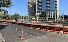 Preparatory works began in February, with major construction spanning from the Easter break of 2013.[9][13] The commencement of major works necessitated the full closure of St Kilda Road, with trams terminating either side of the interchange, and passengers walking around the works site to continue their journey.[14] Major works commenced on 29 March with a full closure of the intersection, St Kilda Road opening two lanes on 3 April, and partial road closures continuing for the duration of the works.[15][10] The completed interchange opened on the morning of 12 April 2013.[16][17]
