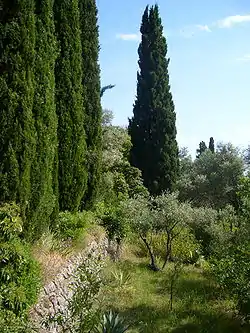 The garden surrounds a Provençal bastide at the foot of Mount Coudon. It features an alley of old olive trees, an alley of stairways bordered by very old plane trees, oleander trees, and an irrigation system using gravity and a system of wells, springs, fountains and basins at different levels. Trees in the garden include Photinia serratifolia, Cocculus laurifolius, pinus pinea, oleander. cypress, fig trees. pittosporum, pomegranate, wild quince trees, loquat trees, and persimmon trees.
