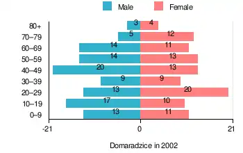 According to the 2002 Poland census, there were 211 people residing in Domaradzice village, of whom 51.2% were male and 48.8% were female. In the village, the population was spread out, with 20.4% under the age of 18, 37.9% from 18 to 44, 22.3% from 45 to 64, and 19.4% who were 65 years of age or older.[1]