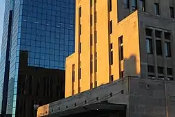 The Dominion Public Building is an Art Deco office building located on Richmond Street in the heart of London, Ontario, Canada. Construction on the building started in 1935 and concluded with the building's inauguration in September 1936.[1] The Dominion Public building was a result of the Public Works Construction Act of 1934 which laid out a plan to reinvigorate Canada's economy through public works projects.[2] The building was designed by Chief Public Works Architect Thomas W. Fuller with the help of three London architects: John MacLeod Watt, Victor Joseph Blackwell and Roy O. Moore.[3] The building displays a physical essay of "the New Classicalism or Modern Classicalism"; this architectural approach is a take on the Art Deco style of architecture and is what highlights this building as a piece of Canadian Heritage.[3]