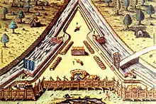 Embittered by the cruelty and indignity that he had suffered from the Spaniards, de Gourgue determined to avenge the murder of his Protestant compatriots, though he was himself a Catholic.[1] He sold everything he had and borrowed money from his brother Antoine to recruit a crew and charter three ships. He sailed to Cuba with two hundred men, never telling them the goal of their trip. Once in Cuba he made his intentions clear, and his crew approved his choice of revenge. Gourgue then moved to attack Spanish-held Fort Caroline, which they had renamed as Fort San Mateo, enlisting the aid of Fort Caroline's old allies, the Saturiwa and Tacatacuru clans of the Timucua Indians. The fort soon surrendered to de Gourgue's forces. The French and Indians killed the Spanish prisoners in retribution for Fort Caroline and other massacres of Protestants.[3] They hanged the prisoners with the inscription, "Not as Spaniards but as murderers."[2]