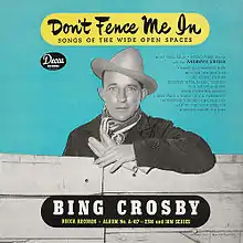 Don't Fence Me In is a compilation album of phonograph records by Bing Crosby and The Andrews Sisters released in 1946 featuring Country and Western songs. This album contained the enormously popular record "Pistol Packin' Mama", which sold over a million copies and became the first number one hit on the then-new Juke Box Folk Song Records Chart that was later renamed the Hot Country Songs Chart.[1]