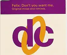 "Don't You Want Me" is a song recorded by British DJ and producer Francis Wright, known under the pseudonym of Felix, released in July 1992 as his debut single from his album, #1 (1993). Musically, it samples Jomanda's "Don't You Want My Love" and credited as Felix featuring Jomanda (remixed by Rollo and Red Jerry). Released on 27 July 1992, the song reached number six on the UK Singles Chart reached number one in Finland, Spain, and Switzerland. It also went to number one on the US Billboard Hot Dance Club Play chart and on the European Hot 100 Singles chart. In 1995 and 1996, the song charted in the UK again, but in remixed form. British magazine Mixmag ranked the song number 98 in its "100 Greatest Dance Singles Of All Time" list in 1996.[2]
