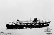 Don Isidro, delivered in 1939, was the second and larger of two Krupp built motor ships of De La Rama Steamship Company, Iloilo, Philippines in inter-island service.[2][4] The ship under a time charter[1] by the United States Army as a transport during the Japanese invasion of the Philippines. As defending forces became cut off from supply by the Japanese blockade Don Isidro was one of eight ships, only three of which were successful, known to make an attempt to run the blockade.[5] In that attempt, under her captain Rafael J. Cisneros, Don Isidro became involved in the 19 February Japanese attack on Darwin, Australia where, though not in the port, she was strafed, bombed and left off Bathurst Island burning with all lifeboats destroyed. The captain attempted to make land when she grounded about three miles off Melville Island to which survivors swam. Of the sixty-seven crew and sixteen soldiers aboard eleven of the crew and one soldier were killed or missing. Survivors were rescued by HMAS Warrnambool, taken to Darwin, treated at the hospital and then awaited orders at the 147th Field Artillery camp.[6][7]
