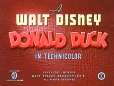 After his debut in the short film The Wise Little Hen from the series Silly Symphony, Donald Duck became a recurring character in the short films of the series Mickey Mouse. Due to his popularity, Donald began starring in his own series of shorts, beginning with Donald's Ostrich on December 10, 1937. Two shorts originally from the Mickey Mouse series, Don Donald (1937) and Modern Inventions (1937), were later re-released as shorts in the Donald Duck series. Similar to the Mickey Mouse series, the Donald Duck shorts begin with a close-up of Donald's face with a starburst behind him, followed by the title "A Walt Disney Donald Duck". The World War II-themed Donald shorts released during the 1940s, in which Donald is shown enlisting in the military, feature a variant of Donald's face with his sailor's hat exchanged for his privater's cap.[1] Other Walt Disney Productions short films starring Donald outside of the Donald Duck series, like How to Have an Accident at Work (1959) – released as A Walt Disney Cartoon – and some educational films from 1960s, also include Donald's starburst picture in their introduction. In the shorts filmed in CinemaScope, also the intro changes to one with Donald shining a flashlight on the image with his face and then the text of the intro.