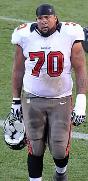 Penn was signed by Tampa Bay after he was released from the Minnesota Vikings in 2006. Later in the season in a game against the Miami Dolphins, Penn blocked an extra point attempt. On April 10, 2009, he signed a one-year $2.792 million contract to stay with the Buccaneers.[1] On July 30, 2010, Penn signed a six-year $43 million contract.[2] Penn scored his first ever touchdown in the NFL on November 21, 2010 against the San Francisco 49ers. It came on a one-yard pass from Josh Freeman to put the Buccaneers up 21-0 in the 4th quarter. Penn was named to the 2011 Pro Bowl as an alternate. He replaced Green Bay Packers tackle Chad Clifton, whose team advanced to Super Bowl XLV.[3] On November 11, 2013, Penn scored his second career touchdown against the Miami Dolphins, which was also his 100th consecutive game started.[4] Penn was released on March 13, 2014.[5]