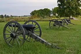 At the Battle of Antietam on 17 September 1862, the Donaldsonville Artillery was equipped with three 6-pounders, two 10-pounder Parrott rifles, and one 3-inch Ordnance rifle. The battery reported no casualties during the action.[1][10] Maurin's battery was part of Major John Selden Saunders' artillery battalion, part of Anderson's division. The unit unlimbered near Piper's barn along with Captain Cary F. Grimes' Virginia battery.[11] After bitter fighting, Union forces drove the Confederate infantry from Bloody Lane. After 1:00 pm, a further Union advance was blocked by Saunders' four batteries, including Maurin's.[12] After 2:00 pm, while firing from Cemetery Hill, the battery helped block a Federal thrust from Middle Bridge.[13] At the Battle of Shepherdstown on 19 September, Maurin's battery took losses of 1 killed and 2 wounded.[14] The battery also lost one 10-pounder Parrott rifle, which had originally been captured from 5th U.S. Artillery, Battery D at the First Battle of Bull Run.[15] While retreating cross-country from Union pursuit at night, the crew encountered an impassable woods; they abandoned and spiked the gun. At Shepherdstown, one caisson with 6-pounder ammunition was blown up by a Union shell and 20 horses were killed.[16]