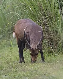 Animal species include the endangered yellow-cheeked gibbon. Wild elephants once roamed the area, but now only domesticated ones are found. Bird life includes the grey-faced tit-babbler, found only in Indochina, and rare hornbills.[1][2] The wetlands are home to the Siamese crocodile, hog deer and green peafowl, all endangered.[3]