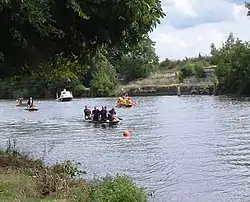 Dongola racing is a popular event in traditional local regattas, especially on the River Thames in southern England and was first competed at Maidenhead in 1886.[1] Competitors use wide punts and a team of (usually six) people with single-bladed paddles, facing forwards and kneeling, normally with one leg up and one leg down. The person at the rear is responsible for the steering with their paddle.
