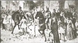 After the Ottoman conquest of Albania, the Kastriotis were given peerage in the Kingdom of Naples.[6] They obtained a feudal domain, the Duchy of San Pietro in Galatina and the County of Soleto (Province of Lecce, Italy).[7] Gjon Kastrioti II, Donika's and Skanderbeg's only child, married Jerina Branković, the daughter of Lazar Branković, Despot of Serbia.[7]