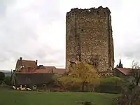 Today, only the keep, which is 20 m (66 ft) high, remains on a low motte. A farm leans on the ruins.