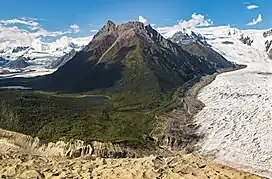 Donoho Peak is a 6,696-foot-elevation (2,041 meter) mountain summit located in the Wrangell Mountains, in the U.S. state of Alaska. The peak is situated in Wrangell-St. Elias National Park and Preserve, 6 mi (10 km) north-northwest of Kennecott, and 9 mi (14 km) north of McCarthy, at the confluence of the Kennicott Glacier and Root Glacier. The peak's name was reported in 1931 by the United States Geological Survey.[3] The mountain lies within the Copper River drainage basin. Bears frequent the Donoho Peak and Donoho Lakes area. An ascent of the mountain involves 14 miles round-trip from Kennecott to the summit, including crossing the Root Glacier and gully scramble via the south aspect of the mountain. Ruins of the Regal Mine remain at an elevation of 5,440 feet on the south slope of the mountain. Only small amounts of copper ore were ever produced, however. On a clear day the summit of Donoho Peak offers views of Mount Blackburn to the northwest and the Stairway Icefall on Regal Mountain to the north-northeast.