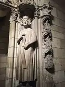 The two kings are positioned beneath canopies, and are flanked by colonnettes. They were for a time believed to be David and Solomon, but were identified as Clovis and Chlothar in part from the large scrolls held in their hands, which are more associated with early medieval nobles than biblical figures. The scroll held by Clovis is thought to be the founding document for the abbey, that held by Chlothar the legal confirmation.[3] The capitals are elaborately decorated with carvings of foliage. Carvings of angels hover in the archivolts above the kings.[9]