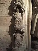 There are three arches linking the doorway to the overhead vault.[14] A trilobed arch over the tympanum, a middle arch with kneeling angels, and an outermost arch resting on the piers.[15] The tympanum contains carvings showing the Coronation of the Virgin, a popular theme for the tympana of 13th century French doorways.[16] The passage has suffered some damage, and some figures have lost their heads or hands. The passage shows the Virgin sitting to Christ's right (the place of honor), bending toward him as he crowns her with his right hand. Her arms are raised in a gesture of veneration. He is holding a jeweled disk, representing his dominion, and is positioned on two lions, indicating that he is occupying the throne of Solomon.[17] Mary's feet rest on a serpent-like creature, probably an adder.[16]