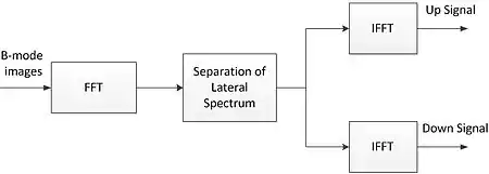 The right figure illustrates the procedure of creating the synthetic lateral phase, as a first step. Basically, the lateral spectrum is split in two to generate two spectra with nonzero center frequencies. The cross correlation is done for both the up signal and down signal, creating and respectively.[9] The lateral correlation function and axial correlation function are then calculated as follows: