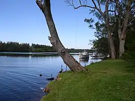 There is an interesting geological phenomena at Dora Creek's connection to the lake. The banks of the creek have formed into two peninsula jutting out into the lake like a point. Thus the aboriginal name is explained, the creek is literally in a lake—the points are merely the banks of the creek! The sediment deposited by the creek has not formed a large flood plain or river delta, but has left behind two banks. This is where the agitation of the lake by winds causes enough erosion to wash away the flood plain that would otherwise appear at the delta or near were a creek floods. However the erosion caused by the lake's waves is not enough to erode away the clay sediments that deposit on the banks of the creek. For that reason, the banks of the creek have grown due to flooding, and appear now as two points, with a creek inside. Similar structures can be seen at creeks nearby too, with good examples at Stoney Creek, Lake Street, Blackalls Park, which is more clearly a type of river delta, where the flat land is created by floods deposition, and at Wyong Creek in a lake a little south, where a similar "two points with creek inside" or "creek in lake", is in existence, but they are smaller and demonstrating how the points grow.[3]