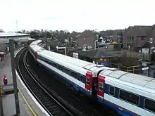 Originally named Dorchester, the station was renamed Dorchester South on 26 September 1949.[1] The station remained a terminus with trains from Bournemouth having to enter the station, reverse out back the way they came then reverse again and proceed to Weymouth. Trains from Weymouth had to pass the station, then reverse into it, and then back out.[3] This process often caused delays and brought criticism following an accident in 1877. As a result, a curved platform was provided for southbound trains; this was brought into use during 1878.[4] Eastbound trains still reversed into the original platform until 1970 when a platform was built on the curve. The buildings on the trackless original platform remained in use until 1989. As part of the modernisation work preparatory to electrification a new booking hall was built on the curved platform, replacing the building on the original platform which was then demolished.