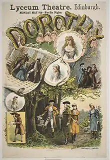 The revised Dorothy became a great success at the box office and had an initial run of 931 performances, breaking the record for the longest-running musical theatre production in history and holding this record until the run of the musical play A Chinese Honeymoon in the early 1900s.[8] It was also the second longest known run for a stage production of any kind, after Our Boys, an 1875 vaudeville play, until both were surpassed by the run of Charley's Aunt in the 1890s.[8] The show's hit songs included the ballad "Queen of My Heart", "Be Wise In Time", "Hark For'ard!", "With A Welcome To All", and "The Time Has Come." Henry Leslie made so much money from Dorothy that he was able to build the Lyric Theatre, where the show transferred in 1888. The success of the show also spurred revivals of some of Cellier's earlier works.[9] Some critics reconsidered their earlier condemnation, the work became regarded as a classic Victorian piece,[4] and the initially despised plot was traced seriously back to the Restoration playwrights David Garrick and Aphra Behn, and to Oliver Goldsmith and even Shakespeare.[10]