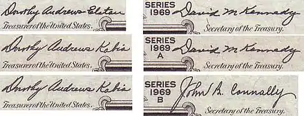 As Elston, Kabis signature appeared on the series 1969 one-dollar bill. The resulting change in Kabis' signature appeared first on the Series 1969A note, so designated to show a different name as treasurer, even though it was the same person.[5]