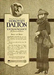 Her role in The Disciple, however, in which she attracts a man who is not her husband, led to her being cast as a vamp. Her vamp, however, was untraditional in that she vamped unconsciously; in the words of Kay Anthony, "Not because she wanted people to think she was a full-fledged shatterer of hearts before the camera did she make pulses beat hard and fast, but because she couldn't help it: 'I guess I just must have been born that way!'"[3] Ince's company was operative from 1919 until his death in 1924. With Ince, she played in The Price Mark and Love Letters, both co-starring William Conklin. Dalton also performed with Rudolph Valentino in Moran of the Lady Letty (1922), and with H.B. Warner in The Flame of the Yukon (1917) and The Vagabond Prince (1916). Dalton's stage career included performances as Chrysis in Aphrodite by Morris Gest in 1920.[4]