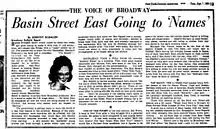 On April 11, 1955, Dandridge became the first black performer to open at the Empire Room at New York's Waldorf-Astoria hotel.[22] Her success as a headliner led to the hotel booking other black performers, such as the Count Basie Orchestra with vocalist Joe Williams, Pearl Bailey, and Lena Horne.[23]