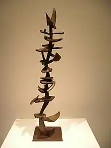 Her work "Rites at Sal Safaeni Number 2" (1958) was included in “Recent Sculpture USA”, a 1959-1960 US travelling exhibition that was presented at the Museum of Modern Art,[42] New York, the Denver Art Museum, Denver, Los Angeles County Museum of Art, Los Angeles, City Art Museum (now Saint Louis Art Museum), St. Louis, and the Museum of Fine Arts, Boston. Dehner's sculptures were also on display at the 1960 Paris exhibition "Aspects of American Culture." Like many of the other works included, hers were primarily distinguished by their improvisation.[43] In 1965, The Jewish Museum in New York City put on a retrospective exhibit of Dehner's sculpture.[44] This achievement is miraculous considering that she only began sculpture a decade earlier. In 1966 she had a solo exhibition, "Dorothy Dehner: Recent Bronzes." It was held in Willard Gallery, New York City. [45] Dehner began experimenting with wood sculpture in 1974, following the death of her second husband.[46] Much of Dehner's sculpture can be identified by its totemic qualities and emphasis on Constructivist principles. Additionally, it differs uniquely from Smith's work in its medium and construction. Much of Smith's sculpture employed welding as a construction technique, which Dehner did not embrace.[47] In 1981 she took her sculpture to the next level, literally, and experimented with massive steel sculptures. In 1988 Dehner had solo exhibitions featuring her large welded pieces at Twining Fine Art, New York, and at Muhlenberg College, Allentown, Pennsylvania. This was the first time in her life that Dehner had a generous personal income.[48] By 1991 Dehner had lost nearly all of her vision and stopped sculpting. By 1990, however, Dehner was working with fabricators who helped transform some of her earlier drawings into sculptures such as the painted aluminium wall piece.[49] After a prominent career in art, Dehner was found dead in a stairwell outside her apartment in Manhattan on September 22, 1994, at the age of ninety-two.[50][51]