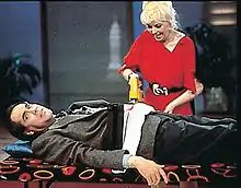 On television, Dorothy Dietrich won attention as a woman who, instead of allowing herself to be sawed in half, reversed the traditional illusion and severed into two parts the male hosts of talk shows and network specials.[8] As word got around she was called to do a Bill Cosby[14] special while still in her early teens, but with the help of her sophisticated style and makeup she passed as an adult and was able to work night clubs and banquets in the best hotels and venues. Cosby was so impressed that he recommended her to several agents. At this same time she performed with Loretta Lynn, Dick Van Patten, Henny Youngman, Jonathan Winters, and Tony Randall.