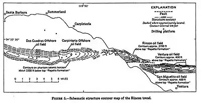 The Dos Cuadras Offshore Oil Field is a large oil and gas field underneath the Santa Barbara Channel about eight miles southeast of Santa Barbara, California. Discovered in 1968, and with a cumulative production of over 260 million barrels of oil, it is the 24th-largest oil field within California and the adjacent waters.[1] As it is in the Pacific Ocean outside of the 3-mile tidelands limit, it is a federally leased field, regulated by the U.S. Department of the Interior rather than the California Department of Conservation. It is entirely produced from four drilling and production platforms in the channel, which as of 2009 were operated by Dos Cuadras Offshore Resources (DCOR), LLC, a private firm based in Ventura. A blowout near one of these platforms – Unocal's Platform A – was responsible for the 1969 Santa Barbara oil spill that was formative for the modern environmental movement, and spurred the passage of the National Environmental Policy Act.