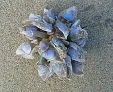 As an adult, D. fascicularis lives attached to a float made either of natural flotsam or of a cement it secretes itself, which has a texture like that of expanded polystyrene foam.[4] It is the only barnacle to produce its own gas-filled float.[2] The cyprid larvae are planktonic, and must attach to a float for metamorphosis into the adult form, but the adults are eventually capable of using their own float, sometimes forming aggregations of many individuals attached to a single float. Among the floats used by adult buoy barnacles are pellets of tar,[5] seaweeds,[2][6] plastic debris,[6] driftwood,[6] feathers,[2][3] cranberries,[2] cuttlefish bone,[2] the "by-the-wind-sailor" Velella velella, seagrass leaves,[3] Styrofoam,[5] seeds,[5] and even apples;[2] they have even been known to colonise the backs of turtles[7] and the sea snake Pelamis platurus.[8] It is a fugitive species, which can be out-competed by other barnacle species, and relies on being able to colonise surfaces and reproduce quickly; after settling on a float, D. fascicularis can reproduce within 45 days.[9] D. fascicularis appears to be increasing in abundance as a result of anthropogenic marine debris accumulating in the sea;[5] this source of floats was of "minor importance" in 1974.[3]