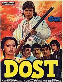Dost (transl. Friend) is a 1989 Hindi film directed by K. Murali Mohana Rao and produced by A. Suryanarayana under Bhanodaya Productions banner. Mithun Chakraborty, Amala played the lead pair of this family drama. The lyrics were written by Indeevar with music composed by R. D. Burman.