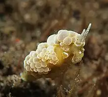 This nudibranch is mostly uniform yellow to pale olive-brown in colour. The ceratal tubercles are large and globular and completely obscure the back when the animal is at rest.[2]