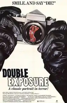 Double Exposure is a 1982 American horror film written and directed by William Byron Hillman, co-produced by Michael Callan, and starring Callan, Joanna Pettet, James Stacy, and Seymour Cassel.[2] It is a loose remake of the 1974 film The Photographer,[3] which was also written and directed by Hillman, produced by Deming, and starring Callan. The film follows a photographer who starts to experience dreams in which he murders the models he photographs.