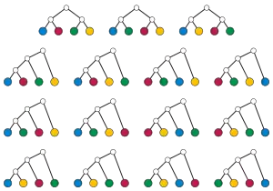 - Rooted binary trees with n + 3/2 labeled leaves. This case is similar to the unrooted case, but the number of edges that can be subdivided is even, and in addition to subdividing an edge it is possible to add a node to a tree with one fewer leaf by adding a new root whose two children are the smaller tree and the new leaf.[1][8]