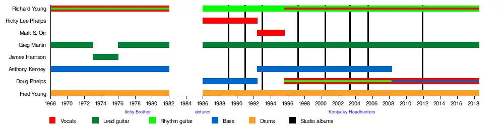 The Kentucky Headhunters are an American country rock and Southern rock band originating in the state of Kentucky. The band's members are Doug Phelps (vocals, bass guitar), Greg Martin (vocals, lead guitar), and brothers Richard Young (vocals, rhythm guitar) and Fred Young (vocals, drums). They were founded in 1968 as Itchy Brother, which consisted of the Young brothers and Martin, along with Anthony Kenney on bass guitar and vocals. Itchy Brother performed together until 1982, with James Harrison replacing Martin from 1973 to 1976. The Youngs and Martin began performing as The Kentucky Headhunters in 1986, adding brothers Ricky Lee Phelps (lead vocals, harmonica) and Doug Phelps (bass guitar, vocals) to the membership.