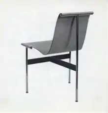 Kelley was born in Buffalo, New York on August 9, 1928. He studied at Pratt Institute in New York City, where he met Ross Littell and William Katavolos.[1] They started work for Laverne Originals, a furniture company, designing furniture, textiles and dinnerware.[2] While at Laverne, they designed the 'T-chair',[3] which won the A.I.D (American Society of Interior Designers) Award in 1952 for the best furniture design in the United States.[1] The chair has three legs of chrome steel, connected by a T-shaped stretcher in black enamelled steel. The sales brochure for the chair explained: 'We sought furniture that would work within a way of building, which would not complement or compete but in a sense continue the program of lines and planes and function as structural elements of the whole'.[1] The chair is now part of the permanent collections of MOMA,[3] the Art Institute of Chicago,[4] the Metropolitan Museum in New York,[5] the Vitra Design Museum[6] and the Victoria & Albert Museum.[1]
