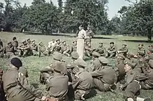 In early October Graham received a leg injury and returned to England for recovery, his place as GOC being taken over by Major General Lyne, formerly Graham's senior brigade commander in the 56th Division before taking over the 59th (Staffordshire) Infantry Division.[43] Graham returned to the 50th Division as GOC once again in late November, by which time the War Office had decided to break up the division, although, because of its distinguished history it was reduced to the role of a reserve division. The British Army was, by this stage of the war, suffering from a very severe shortage of manpower, and there simply were not enough men to keep all the active divisions up to strength and this, combined with Montgomery's belief that the division was no longer combat-worthy (and his sudden and harsh assessment of Graham, who he had previously thought very highly of, as being too old and only fit for a training command),[1] was the main reason why the 50th Division was chosen for disbandment.[43][44] Returning to England in December, the division became a reserve training formation, keeping its three infantry brigades but losing most of its supporting artillery and engineer units, and was given the role of training soldiers who had completed their basic training before being sent to an overseas unit.[43] Graham received a further mention in despatches for "gallant and distinguished services in North West Europe" on 22 March 1945.[45]