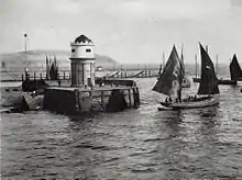 There was to be a small lighthouse tower on the southeast end of the outer end of the landing pier,[17] containing a powerful condensing apparatus so as to show a coloured light only in the lines of the entrances to the harbour. This enabled an accurate approach to be made at night for the first time.[17]