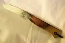 Originally intended as an inexpensive utility pocket knife for the ordinary working man, the popularity of the douk-douk caused it to be pressed into service as a weapon when necessary.[1] During the 1954-1962 FLN-led revolt in Algeria, the douk-douk was used as weapon of assassination and terror; Algerians who ran afoul of the FLN frequently had their noses removed with a knife, many of them douk-douks (or more properly the El Baraka model which was sold in Algeria, due to Muslim ideals on what sorts of images were appropriate).[1] It could easily be converted from a folding-blade pocket knife into a useful fixed-blade knife by the simple expedient of hammering the ends of the sheet-metal handle together behind the blade's bolster, locking the blade into the full-open position.