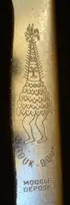 The external engraving of the douk-douk was created in 1929 by Gaspard Cognet of Cognet, Antoine & Gaspard for sales to France's colonies in Oceania. The handle depicts a "douk-douk", or Melanesian spirit incarnation. Cognet based the design on an engraving in an illustrated dictionary. Later other designs such as the "El Baraka" and "Tiki" were developed for other regional markets, particularly in French Algeria, and even south into Sub-Saharan Africa.