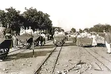 In 1873, the creation of a tramway connection between the station and Cojo Wharf was proposed by engineer Silvério Augusto Pereira da Silva. This connection would use animal-drawn carriages as vehicles, running on rails, to transport passengers or goods.[12] The project, approved by the Chamber, in an alternative route to the previous one and located south of it, eventually did not materialize. However, the idea of the direct connection of the station to Cojo Wharf was considered important, leading to the construction of Americano Street (currently Comandante Rocha e Cunha Street). After the opening of this route, the products from the Aveiro Lagoon started to be transported by sea to the Cojo Wharf, and then transhipped to ox carts and transported through Americano Street to the station, where they were again transhipped in railway carriages, in a more efficient process than the previous one, but still time-consuming, expensive and cumbersome.[5]