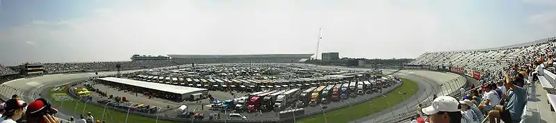 In the following year, the speedway's capacity was expanded to 135,000 seats, the largest of any mid-Atlantic sports venue.[7] After the gaming side of Dover Downs separated, Dover Motorsports, Inc. was created to operate the speedway, which caused the speedway to become Dover International Speedway in 2002.[7] Two years later, the speedway announced the completion of the Monster Bridge, which is a glass-enclosed structure that has 56 seats over the third turn, and its fall NASCAR Cup Series race became the second race in the newly formed, NASCAR Chase for the Championship.[7]