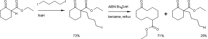 The reaction mechanism involves a bicyclic intermediate. The reaction is initiated by thermal decomposition of AIBN. The resulting radicals abstract hydrogen from tributyltin hydride to a tributyltin radical which in turn abstracts the halogen atom to form an alkyl radical. This radical attacks the carbonyl group to an intermediate bicyclic ketyl. This intermediate then rearranges with ring expansion to a new carbon radical species which recombines with a proton radical from tributyltin hydride propagating the catalytic cycle.