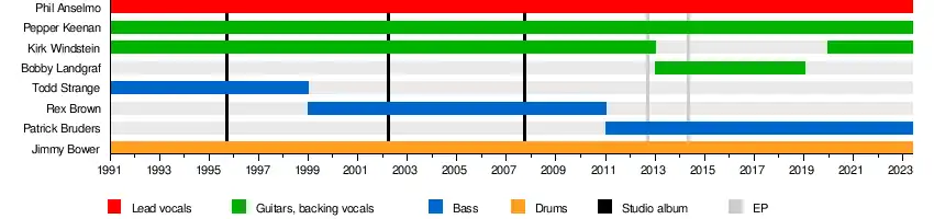 Down is an American heavy metal supergroup that formed in New Orleans, Louisiana, in 1991. The current lineup consists of vocalist Phil Anselmo (Pantera and Superjoint Ritual), drummer Jimmy Bower (Crowbar, Eyehategod, Superjoint Ritual), guitarists Pepper Keenan (Corrosion of Conformity) and Kirk Windstein (Crowbar), and bassist Pat Bruders (Goatwhore).