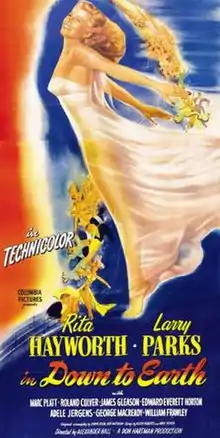 Down to Earth is a 1947 musical comedy film starring Rita Hayworth, Larry Parks, and Marc Platt, and directed by Alexander Hall. The film is a sequel to the 1941 film Here Comes Mr. Jordan, also directed by Hall. While Edward Everett Horton and James Gleason reprised their roles from the earlier film, Roland Culver replaced Claude Rains as Mr. Jordan.